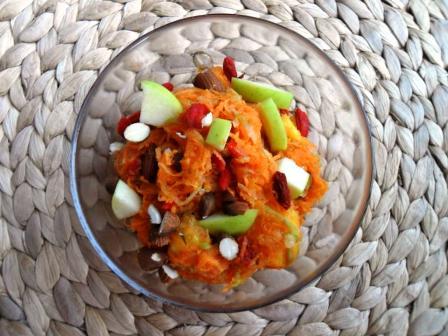 - mrkve a jablko nastrouhejte, oříšky nakrájejte a vše společně smíchejte s čerstvě vymačkanou šťávou z pomeranče